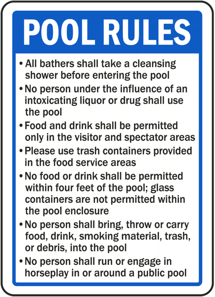 The New Mexico Pool Rules Sign has informational messages for property and swimming policy concerns. The New Mexico Pool Rules Sign is a useful tool to help protect the health and safety of others in pool and swimming areas, and is not a substitute for necessary protective measures for lessening or eliminating hazards. This sign complies with 7.18.4.12 NMAC.