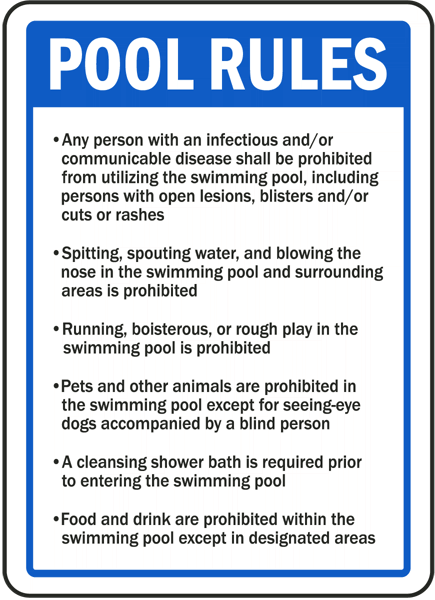 The Rhode Island Pool Rules Sign has informational messages for property and swimming policy concerns. The Rhode Island Pool Rules Sign is a useful tool to help protect the health and safety of others in pool and swimming areas, and is not a substitute for necessary protective measures for lessening or eliminating hazards. This sign complies with CRIR 14-180-006.