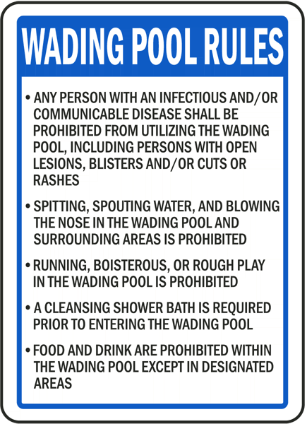 The Rhode Island Wading Pool Rules Sign has informational messages for property and swimming policy concerns. The Rhode Island Wading Pool Rules Sign is a useful tool to help protect the health and safety of others in pool and swimming areas, and is not a substitute for necessary protective measures for lessening or eliminating hazards. This sign complies with CRIR 14-180-006.